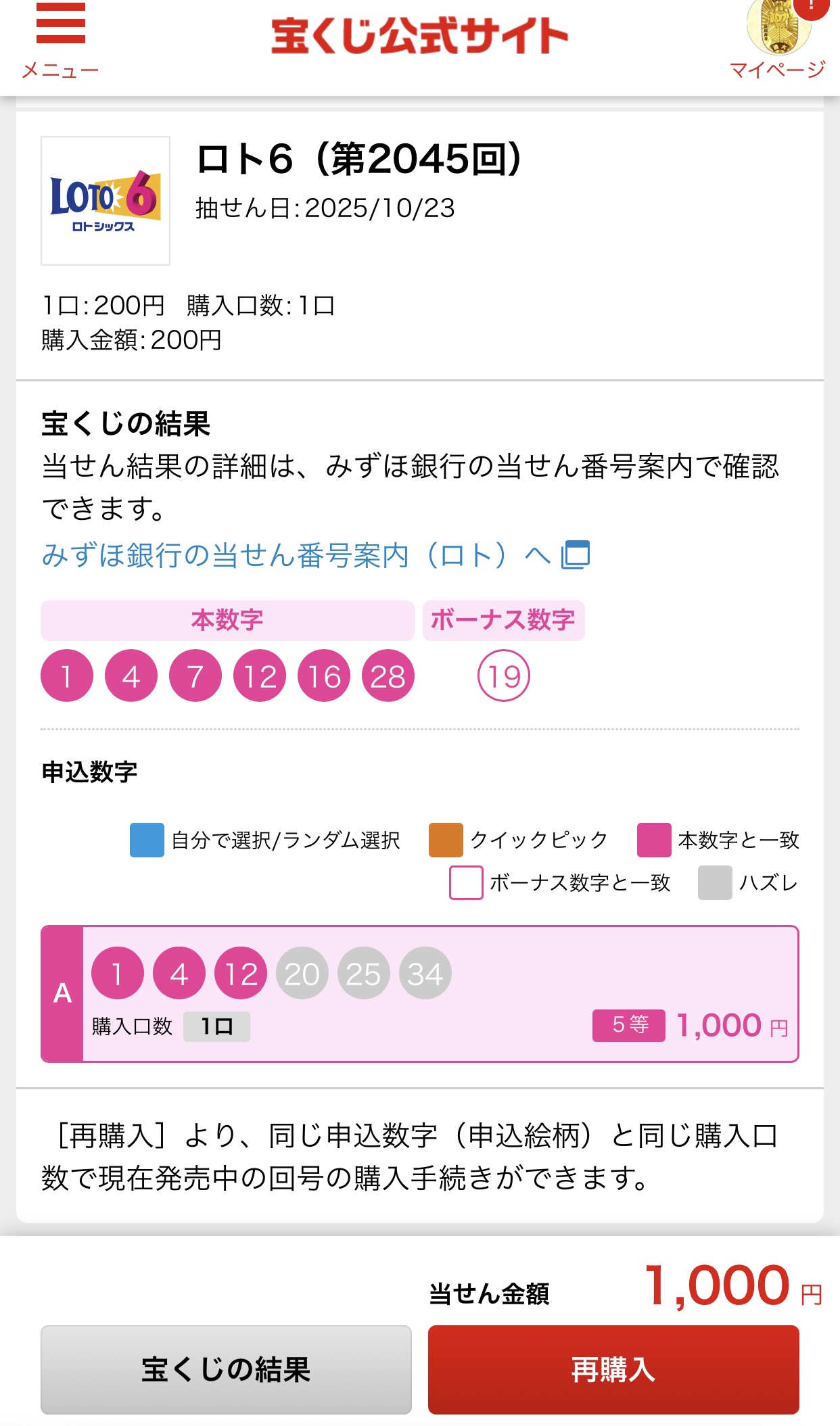 2025.10.23の2045回に5等1,000円当たっりました!!