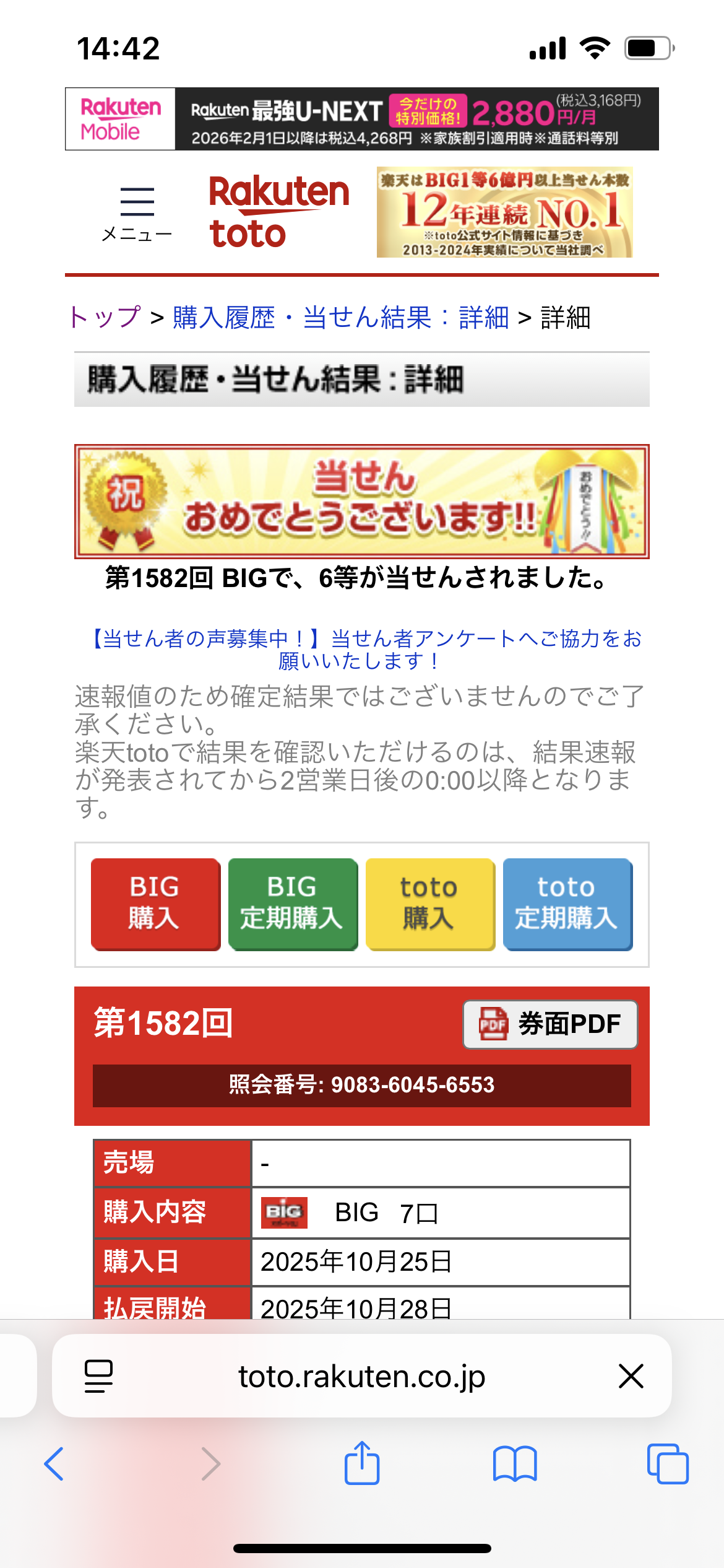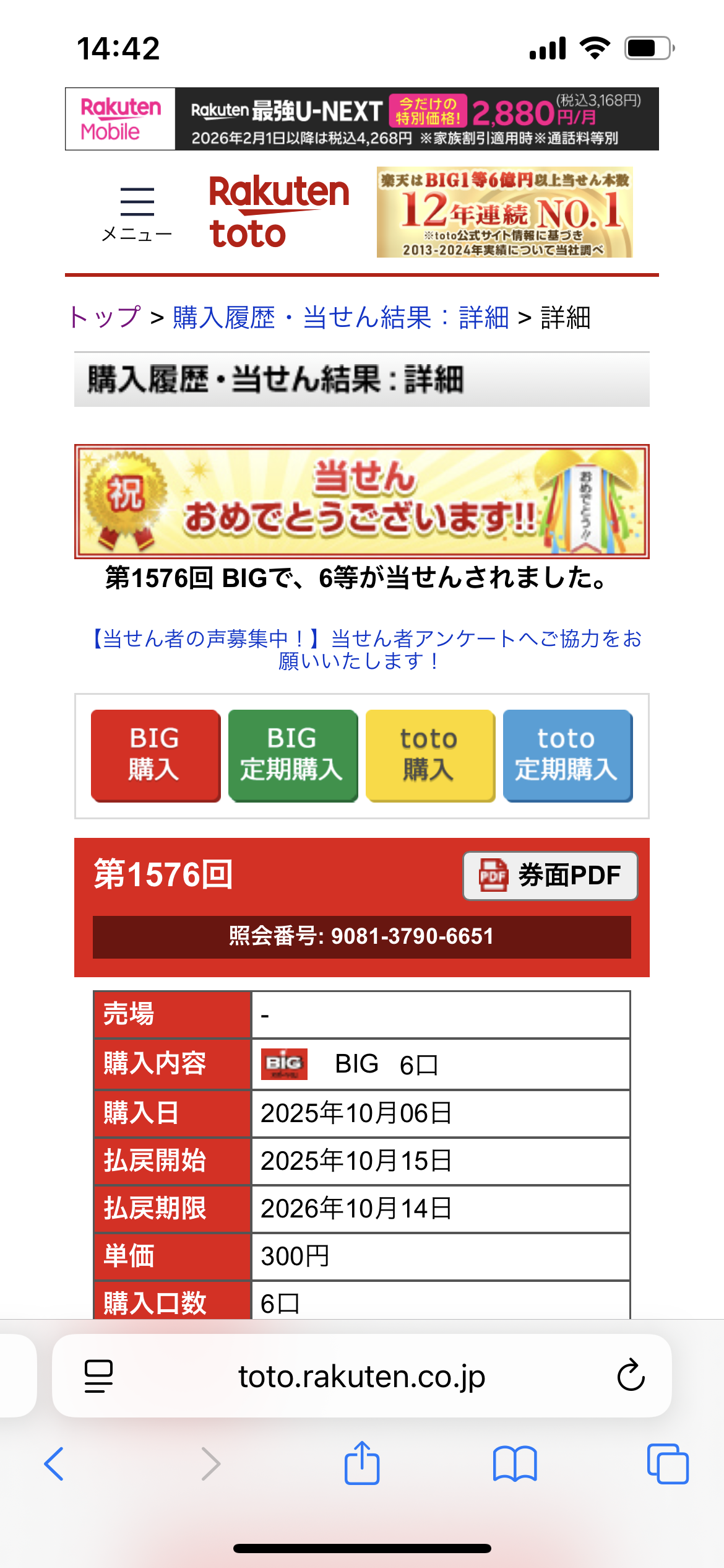 いつもお世話になっております。この度、2回、BIGの六等の当選を叶える事が出来ました。心から感謝申し上げます。ありがとうございました♪これからも怠る事なく、精進して参りますm(_ _)m